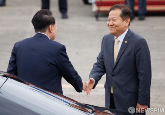 [성남=뉴스핌] 윤창빈 기자 = 필리핀, 싱가포르, 라오스 등 동남아 3개국 순방에 나선 윤석열 대통령이 6일 오전 경기 성남시 서울공항에서 환송 나온 이상민 행정안전부 장관과 인사하고 있다. 2024.10.06 pangbin@newspim.com