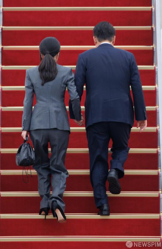 [성남=뉴스핌] 윤창빈 기자 = 필리핀, 싱가포르, 라오스 등 동남아 3개국 순방에 나선 윤석열 대통령과 김건희 여사가 6일 오전 경기 성남시 서울공항에서 출국을 위해 트랩에 오르고 있다. 2024.10.06 pangbin@newspim.com