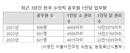 문제는 업무량이 매해 증가하는 점이다. 1인당 소 관리 수는 △2021년 4404마리 △2022년 4569마리에서 지난해 300마리 이상 증가했다. 1인당 닭 관리 수는 △2021년 19만5579마리 △2022년 19만2159마리로 줄었다가 지난해 약 3만마리 늘었다.