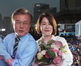 문재인 전 대통령이 대선 후보 시절인 2017년 5월 선거 마지막 유세에서 딸 문다혜씨로부터 카네이션을 선물을 받고 기념촬영을 하고 있다. 경향신문 자료사진 |