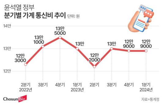 7일 통계청에 따르면 올 1분기 가구당 통신비는 12만9000원으로 집계됐다. 윤석열 정부가 출범한 2022년 2분기(12만3000원) 대비 6000원 증가했다. 지난 2년간 가계 통신비는 12만~13만원대를 오가며 사실상 제자리 걸음을 하고 있다. 정부가 통신비 인하를 유도하기 위해 다양한 정책을 펼쳤지만, 실질적인 효과는 없었다는 사실을 방증한 셈이다.