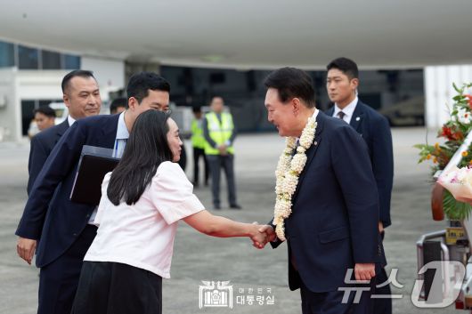(서울=뉴스1) 송원영 기자 = 필리핀을 국빈 방문한 윤석열 대통령이 6일(현지시간) 필리핀 마닐라 니노이 아키노 국제공항에 도착, 환영 나온 관계자들과 인사를 나누고 있다. (대통령실 제공) 2024.10.7/뉴스1sowon@news1.krCopyright ⓒ 뉴스1. All rights reserved. 무단 전재 및 재배포, AI학습 이용 금지.