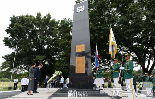 (서울=뉴스1) 송원영 기자 = 필리핀을 국빈 방문 중인 윤석열 대통령과 김건희 여사가 6일(현지시간) 필리핀 마닐라 영웅 묘지 내 한국전 참전 기념비에서 참배하고 있다. (대통령실 제공) 2024.10.7/뉴스1sowon@news1.krCopyright ⓒ 뉴스1. All rights reserved. 무단 전재 및 재배포, AI학습 이용 금지.