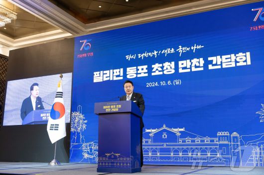 (서울=뉴스1) 송원영 기자 = 필리핀을 국빈 방문한 윤석열 대통령이 6일 오후(현지시간) 필리핀 마닐라 페닌슐라 호텔에서 열린 동포 만찬 간담회에서 인사말을 하고 있다. (대통령실 제공) 2024.10.7/뉴스1sowon@news1.krCopyright ⓒ 뉴스1. All rights reserved. 무단 전재 및 재배포, AI학습 이용 금지.