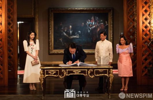 [서울=뉴스핌]윤석열 대통령이 7일(현지시각) 필리핀 말라카냥 궁에서 방명록에 서명하고 있다. 오른쪽은 페르디난드 마르코스 주니어 필리핀 대통령과 배우자 루이즈 아라네타 마르코스 여사, 왼쪽은 김건희 여사.[사진=대통령실 SNS] 2024.10.07 photo@newspim.com