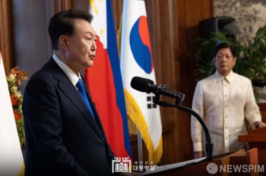 [서울=뉴스핌]윤석열 대통령이 7일(현지시각) 필리핀 말라카냥 궁에서 열린 한-필리핀 공동언론발표에서 발언하고 있다. [사진=대통령실 SNS] 2024.10.07 photo@newspim.com