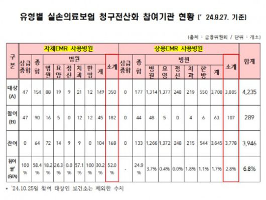7일 김재섭 국민의힘 의원실이 실손보험 청구 전산화(간소화) 전송대행기관인 보험개발원으로부터 제출받은 자료에 따르면, 보건소 등을 제외한 실손보험 청구 간소화 시행 대상인 의료기관 4235개 중 실손보험 청구 전산화에 참여하기로 한 의료기관은 289개로 전체 6%에 불과한 것으로 나타났다.