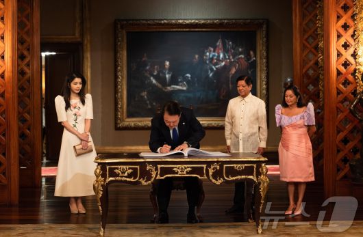 (서울=뉴스1) 송원영 기자 = 필리핀을 국빈 방문한 윤석열 대통령이 7일 오전(현지시간) 필리핀 마닐라 말라카냥 대통령궁에서 페르디난드 마르코스 필리핀 대통령 내외가 지켜보는 가운데 방명록을 작성하고 있다. (대통령실 제공) 2024.10.8/뉴스1sowon@news1.krCopyright ⓒ 뉴스1. All rights reserved. 무단 전재 및 재배포, AI학습 이용 금지.