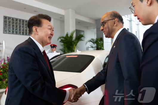 (서울=뉴스1) 박지혜 기자 = 윤석열 대통령이 8일(현지시간) 싱가포르 의회에서 열린 공식환영식에 도착해 타르만 샨무가라트남 싱가포르 대통령과 악수하고 있다. (대통령실 제공) 2024.10.9/뉴스1pjh2580@news1.krCopyright ⓒ 뉴스1. All rights reserved. 무단 전재 및 재배포, AI학습 이용 금지.