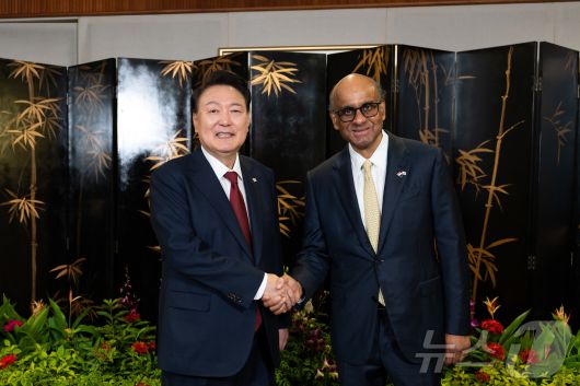 (서울=뉴스1) 박지혜 기자 = 윤석열 대통령이 8일(현지시간) 싱가포르 의회에서 타르만 샨무가라트남 싱가포르 대통령과 면담에 앞서 기념 촬영을 하고 있다. (대통령실 홈페이지) 2024.10.9/뉴스1pjh2580@news1.krCopyright ⓒ 뉴스1. All rights reserved. 무단 전재 및 재배포, AI학습 이용 금지.