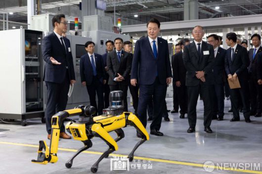 [서울=뉴스핌]윤석열 대통령이 8일(현지시간) 싱가포르 현대자동차 글로벌 혁신센터(HMGICS)를 방문해 로봇개 '스팟'을 바라보고 있다.[사진=대통령실 ] 2024.10.08 photo@newspim.com 저작권자(c) 글로벌리더의 지름길 종합뉴스통신사 뉴스핌(Newspim), 무단 전재-재배포 금지
