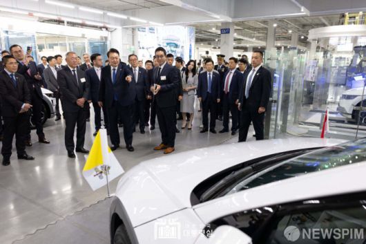 [서울=뉴스핌]윤석열 대통령이 8일(현지시간) 싱가포르 현대자동차 글로벌 혁신센터(HMGICS)를 방문해 교황이 싱가포르 순방 때 탑승했던 아이오닉5 의전차량을 바라보고 있다.[사진=대통령실 ] 2024.10.08 photo@newspim.com 저작권자(c) 글로벌리더의 지름길 종합뉴스통신사 뉴스핌(Newspim), 무단 전재-재배포 금지
