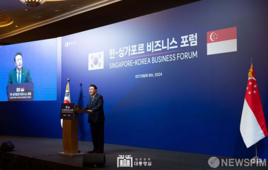[서울=뉴스핌]윤석열 대통령이 8일(현지시간) 싱가포르 한 호텔에서 열린 한-싱가포르 비즈니스포럼에서 기조연설하고 있다. [사진=대통령실 ] 2024.10.08 photo@newspim.com