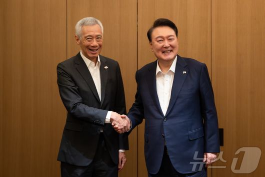(서울=뉴스1) 박지혜 기자 = 윤석열 대통령이 8일(현지시간) 싱가포르에서 리센룽 전 싱가포르 총리를 만나 악수하고 있다. (대통령실 제공) 2024.10.9/뉴스1pjh2580@news1.krCopyright ⓒ 뉴스1. All rights reserved. 무단 전재 및 재배포, AI학습 이용 금지.