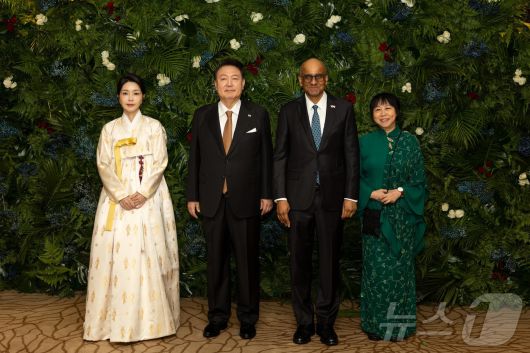 (서울=뉴스1) 박지혜 기자 = 윤석열 대통령과 김건희 여사가 8일(현지시간) 싱가포르의 한 호텔에서 타르만 샨무가라트남 싱가포르 대통령 주최로 열린 국빈 만찬에 참석해 타르만 대통령, 부인 제인 이토기 샨무가라트남 여사와 기념촬영을 하고 있다. (대통령실 제공) 2024.10.9/뉴스1