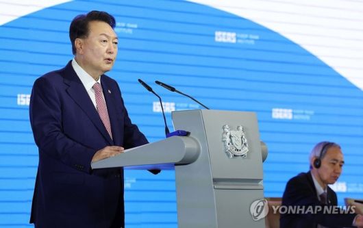 윤석열 대통령이 9일(현지시간) 싱가포르 오차드호텔에서 열린 제47회 싱가포르 렉처에서 기조연설을 하고 있다. [사진 출처 = 연합뉴스] |