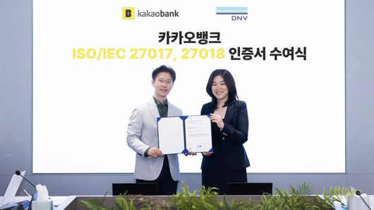 카카오뱅크 민경표 정보보호최고책임자(왼쪽)과 DNV 비즈니스어슈어런스코리아 이소영 대표이사(오른쪽)가 지난 7일 카카오뱅크 판교오피스에서 진행된 ‘ISO/IEC 27017, 27018 인증서 전달식’에 참석해 기념 촬영을 하고 있다. 사진 | 카카오뱅크 |