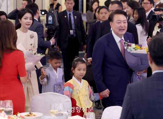 윤석열 대통령과 김건희 여사가 9일(현지시간) 싱가포르의 샹그릴라 호텔에서 열린 동포 오찬 간담회에 입장하고 있다. 김창길기자 |