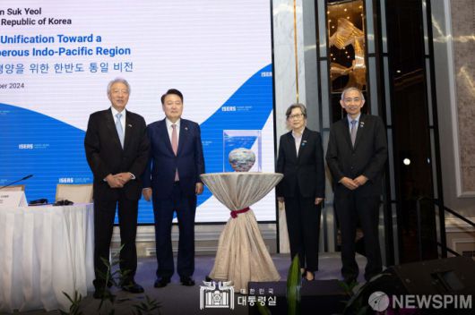 [서울=뉴스핌] 윤석열 대통령이 싱가포르 오차드 호텔에서 열린 싱가포르 정부 산하 동남아연구소 주최 제47회 싱가포르 렉처에서 연설을 마친 뒤 선물받은 기념 도자기 앞에서 기념 촬영을 하고 있다. 왼쪽부터 테오 치 힌 선임장관, 윤 대통령, 찬 헹 치 동남아연구소 이사장, 초이 싱 궉 동남아연구소장.[사진=대통령실 ] 2024.10.09 photo@newspim.com
