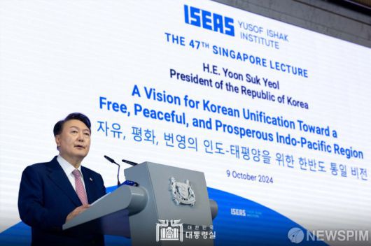 [서울=뉴스핌] 윤석열 대통령이 9일(현지시간) 싱가포르 오차드 호텔에서 열린 싱가포르 정부 산하 동남아연구소 주최 제47회 싱가포르 렉처에서 '자유, 평화, 번영의 인도태평양을 위한 한반도 통일비전'을 주제로 연설하고 있다.[사진=대통령실 ] 2024.10.09 photo@newspim.com
