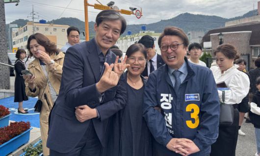 조국혁신당 장현 전남 영광군수 후보(오른쪽)와 조국 대표(왼쪽)가 6일 거리 유세 도중 만난 유권자와 손가락으로 기호 3번을 표시하면서 사진을 찍고 있다. |