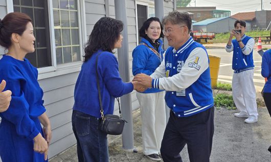 더불어민주당 장세일 전남 영광군수 후보가 8일 염산 농협하나로마트 앞 집중유세에서 한 유권자와 두 손 모아 악수를 하고 있다. |