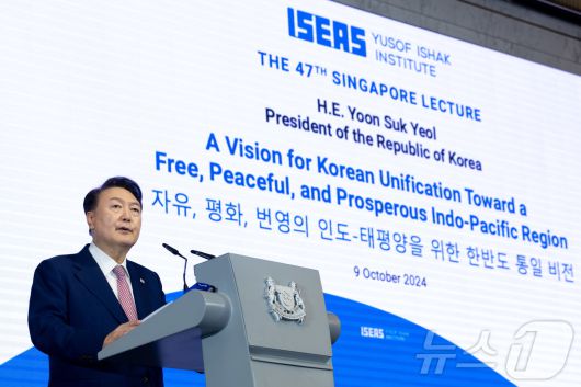 (서울=뉴스1) 송원영 기자 = 윤석열 대통령이 9일(현지시간) 싱가포르 오차드호텔에서 열린 제47회 싱가포르 렉처에서 기조연설을 하고 있다. (대통령실 제공) 2024.10.10/뉴스1sowon@news1.krCopyright ⓒ 뉴스1. All rights reserved. 무단 전재 및 재배포, AI학습 이용 금지.