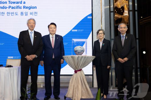 (서울=뉴스1) 송원영 기자 = 윤석열 대통령이 9일(현지시간) 싱가포르 오차드호텔에서 열린 제47회 싱가포르 렉처에서 기념촬영을 하고 있다. 왼쪽부터 테오 치 힌 선임장관, 윤 대통령, 찬 헹 치 동남아연구소 이사장, 초이 싱 궉 동남아연구소장. (대통령실 제공) 2024.10.10/뉴스1