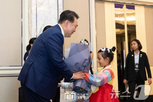 (서울=뉴스1) 송원영 기자 = 윤석열 대통령이 9일 오후(현지시간) 싱가포르 샹그릴라 호텔에서 열린 동포 오찬 간담회에서 화동으로부터 꽃다발을 받고 있다. (대통령실 홈페이지) 2024.10.10/뉴스1sowon@news1.krCopyright ⓒ 뉴스1. All rights reserved. 무단 전재 및 재배포, AI학습 이용 금지.
