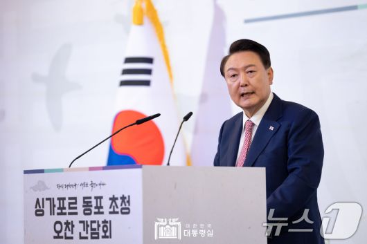 (서울=뉴스1) 송원영 기자 = 윤석열 대통령이 9일 오후(현지시간) 싱가포르 샹그릴라 호텔에서 열린 동포 오찬 간담회에서 발언하고 있다. (대통령실 홈페이지) 2024.10.10/뉴스1