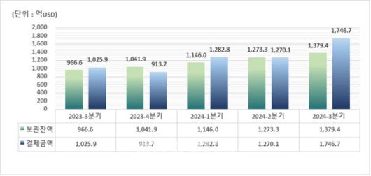 외화주식 보관금액은 1020억4000만 달러로 2분기 말(946억 4000만달러)보다 7.8% 증가했고, 외화채권 보관금액도 전 분기보다 9.8% 증가해 359억 달러를 기록했다.
