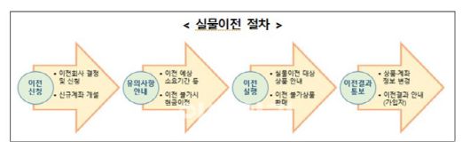 가입자의 계약이전 신청을 받은 퇴직연금사업자는 실물이전 가능 상품목록 등 유의사항을 가입자에게 안내해 가입자의 이전 여부에 대한 최종 의사 확인을 거친 뒤 실물이전을 실행하고 이전 결과를 SMS, 휴대폰 애플리케이션 등을 통해 가입자에게 통보한다.