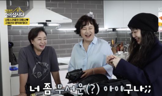 또 무언가 가져온 구혜선. 선물의 정체는 립밤 케이스였다. 이어 맥가이버 칼을 꺼내자 혜은이는 “무섭다”며 웃음 지었다. 또 옷가방을 공개한 구혜선. 보자기에는 콩나물이 담아왔다. 본인이 직접 키워왔다며 엉뚱발랄, 사랑스러운 모습도 보였다.