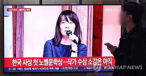 한강 작가 노벨문학상 수상 뉴스 보는 시민 |