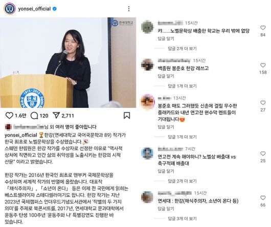 소설가 한강의 노벨문학상 수상 소식을 전한 연세대학교 공식 SNS에 동문, 재학생, 누리꾼의 축하가 이어지고 있다. [연세대 인스타그램 캡처] |