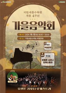 이번 가을음악회는 국립세종수목원 축제마당에서 진행되며 18시 30분부터 식전 마술공연을 시작으로 기념사, 유벨톤 심포니 오케스트라의 공연 순으로 진행될 계획이다.