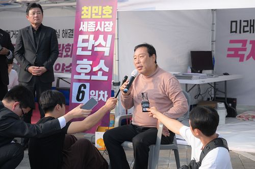 (세종=연합뉴스) 한종구 기자 = 정원도시박람회와 빛축제 등 자신의 공약사업 예산 통과를 촉구하며 단식 농성을 하던 최민호 세종시장이 11일 오후 건강 악화로 단식 중단을 선언했다.