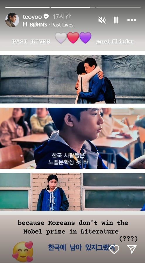 유태오는 10일 자신의 인스타그램 스토리에 지난 2월 국내 개봉한 셀린 송 감독 영화 ‘패스트 라이브즈’ 속 장면 하나를 캡처해 올렸다. 영화 속 주인공이 “한국 사람들은 노벨문학상 못 타”라고 말하는 장면이었다. 유태오는 이 같은 캡처 이미지와 함께 “한국에 남아 있지 그랬어”라는 문구를 덧붙였다.