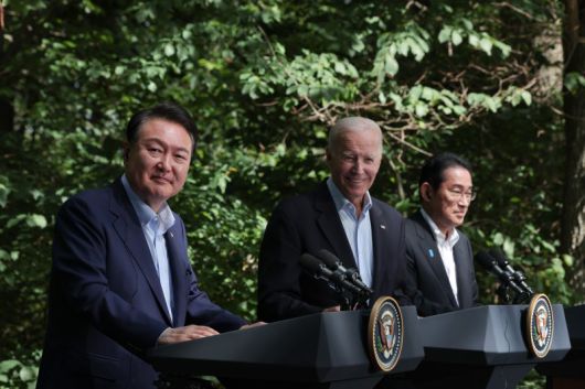 윤석열 대통령과 조 바이든 미국 대통령, 기시다 후미오 일본 총리가 지난해 8월 18일(현지시간) 미국 워싱턴DC 인근 대통령 별장인 캠프 데이비드에서 한미일 정상 공동기자회견을 하고 있다. (대통령실 제공) /사진=뉴스1 |