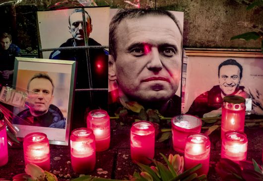 17일(현지시간) 독일 프랑크푸르트의 러시아 영사관 근처에 러시아 야당 지도자 알렉세이 나발니를 추모하기 위한 촛불과 사진이 놓여 있다. 프랑크푸르트(독일)/AP연합뉴스 |
