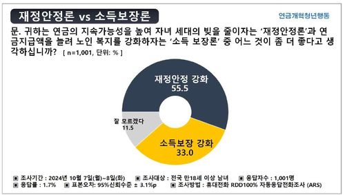 응답자에게 연금개혁안으로 ▲ 소득보장 위해 연금지급액 늘리는 데 중점(소득보장론) ▲ 재정안정 위해 미래세대 빚을 줄이는 데 중점(재정안정론) ▲ 미적립부채는 국고로 해결하고 국민연금 폐지(국민연금 폐지론) 중 하나를 고르게 했는데, 44.9%가 재정안정론을, 21.7%가 소득보장론을 선택했고, 20.7%는 국민연금 폐지론을 주장했다.