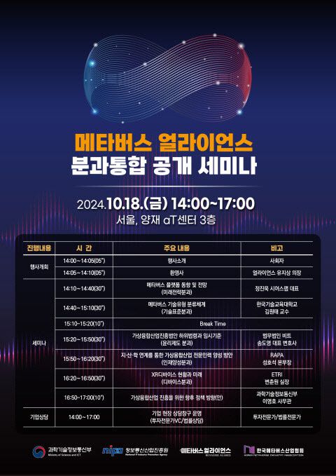 ‘메타버스 얼라이언스 분과통합 공개세미나’는 메타버스 얼라이언스 홈페이지에서 사전 신청을 통해 누구나 무료로 참여 가능하다.