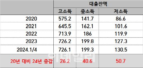 고소득(상위 30%), 중소득(중위 40%), 저소득(하위 30%)단위 : 조원다만 모수 격인 2020년 대출 잔액은 각각 달라 절대 액수에서는 차이가 있었다. 고소득 자영업자(상위 30%)는 2020년 575조2000억원에서 올해 1분기 726조1000억원으로 150조9000억원이 늘었다. 중소득 자영업자는 같은 기간 57조6000억원(141조7000억원 → 199조3000억원), 저소득 자영업자(하위 30%)는 43조9000억원(86조6000억원 → 130조5000억원)이 늘었다.