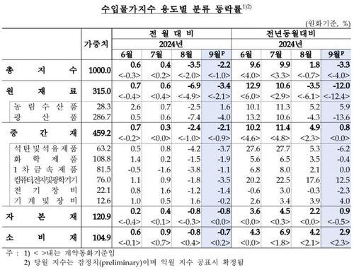 한국은행이 15일 발표한 자료에 따르면, 9월 수입물가지수(원화 기준 잠정치·2020년 수준 100)는 135.19로, 8월(138.23)보다 2.2% 하락했다.