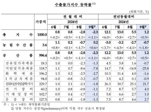 수출물가지수는 8월 130.08에서 9월 127.09로 2.3% 하락했다. 역시 두 달 연속 내림세다.