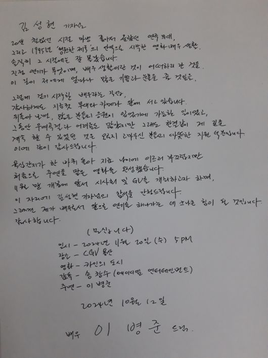 넷플릭스 '더 글로리', JTBC '재벌집 막내아들' 등에 출연해 명품 조연으로 유명한 배우 이병준이 생애 첫 주연 영화 개봉을 앞두고 기자들에게 자필 편지를 보내며 홍보에 나섰다.