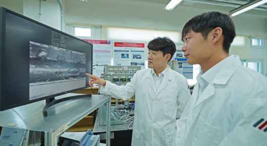 광주과학기술원(GIST) 기계로봇공학부 이승현 교수(왼쪽)가 정해인 박사과정생과 함께 새 기술이 적용된 전기차 충전기 케이블을 모니터링하고 있다. GIST 제공 |