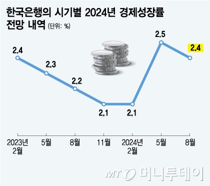 한국은행의 시기별 2024년 경제성장률 전망 내역/그래픽=김지영 |