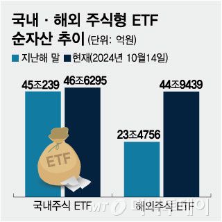 반면 해외주식형 ETF는 종목 수, 순자산 모두 크게 증가했다. 지난해 말 209개 종목 23조4000억원이었던 해외주식형 ETF 순자산은 현재(14일) 262개 종목 44조9000억원으로 크게 늘었다. 미국 주식형 ETF가 33조8000억원으로 70% 이상을 차지했고 중국·홍콩 주식형 상품이 4조원, 일본 ETF가 5000억원 규모다.
