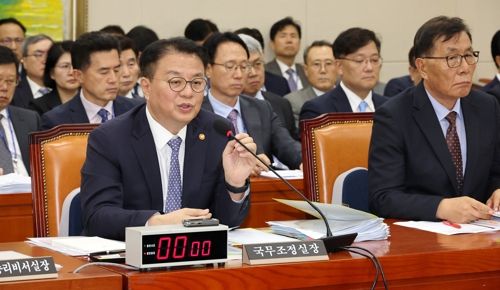 7일 오후 열린 국회 정무위원회의 국무조정실·국무총리비서실 등의 국정감사에서 방기선 국무조정실장이 의원 질의에 답변하고 있다. 연한 회색 정장을 착용한 채 뒤편 우측에 착석한 인물이 한두봉 한국농촌경제연구원장. 연합뉴스 |